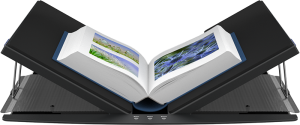 La exclusiva solución de soporte para libros acoplado magnéticamente permite a los usuarios digitalizar libros y documentos de tamaño A2 +, ya sea colocándolos planos sobre la cama de escaneo a 180 ° o en el soporte en V, en un ángulo de 120 ° para un manejo suave y protector del material de origen. Los dos lados de la base están acoplados magnéticamente para que el pliegue del libro se pueda mover fácilmente en el centro para obtener resultados de escaneo óptimos.